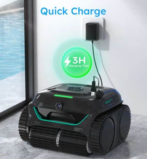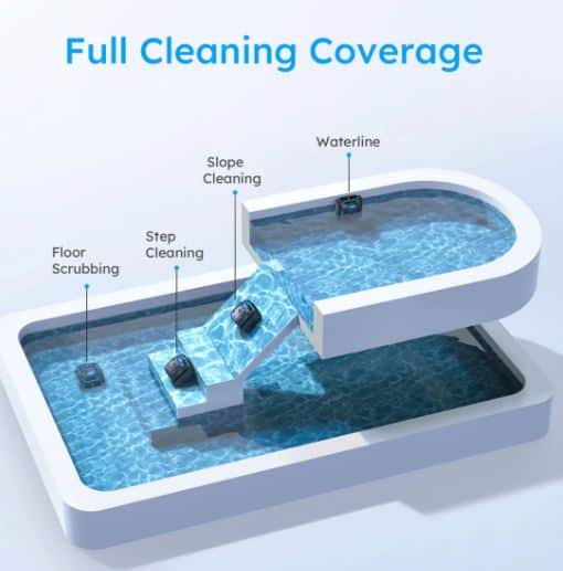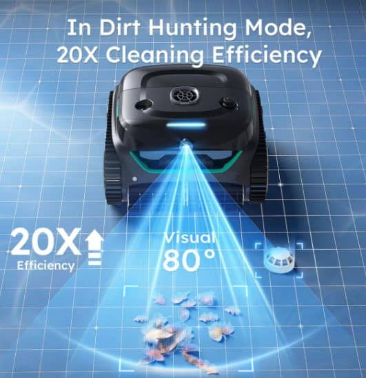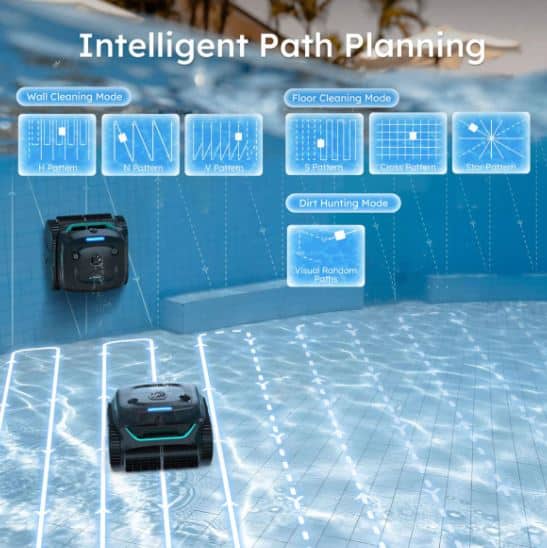 The robot uses intelligent vision-based navigation to map pool surfaces and determine optimal cleaning routes. This smart system ensures efficient cleaning of pool floors, walls and waterlines.